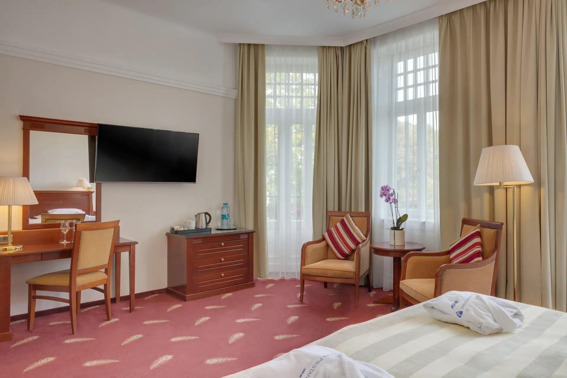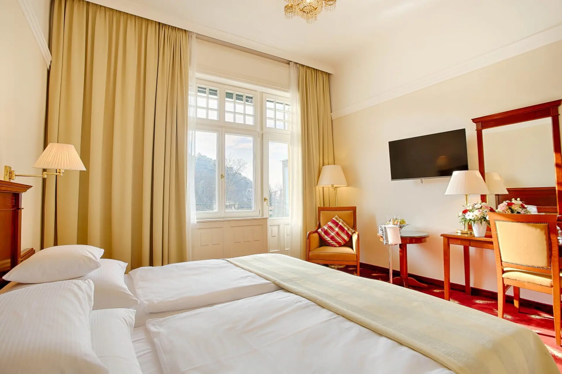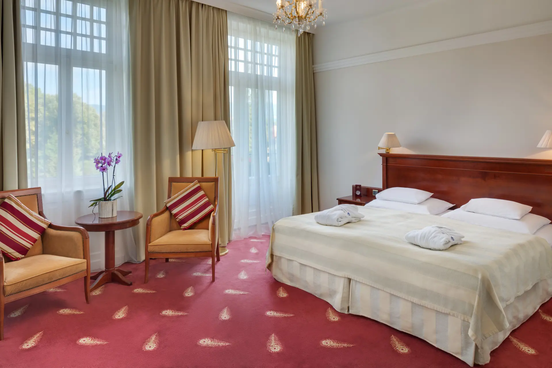 Номера в Thermia Palace — это оазис комфорта и стиля. Просыпаясь утром, вы увидите великолепные виды на зеленый Купельный остров. Все номера были недавно отремонтированы и обставлены классической старинной мебелью. Гармоничные тона и эксклюзивные ткани создают уютную атмосферу, а первоклассные удобства обеспечивают комфорт, который можно ожидать от хорошего пятизвездочного отеля. Комфортабельные, светлые и просторные номера предлагают всё, что нужно для идеального отдыха.